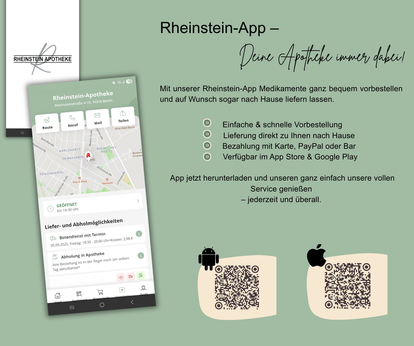 Unsere Apotheke steht nicht nur als vertrauenswürdiger Ort in Ihrer Nachbarschaft, sondern auch als digitaler Begleiter zur Verfügung. Vor Ort bieten wir Ihnen eine persönliche Beratung und Betreuung an. Online stehen wir Ihnen mit derselben Expertise und Fürsorge zur Verfügung. In beiden Dimensionen, physisch und digital, bleiben wir Ihrem verlässlichen Partner in allen Gesundheitsfragen.